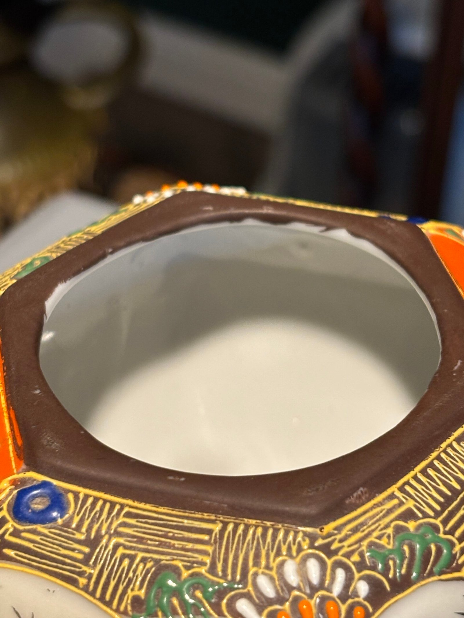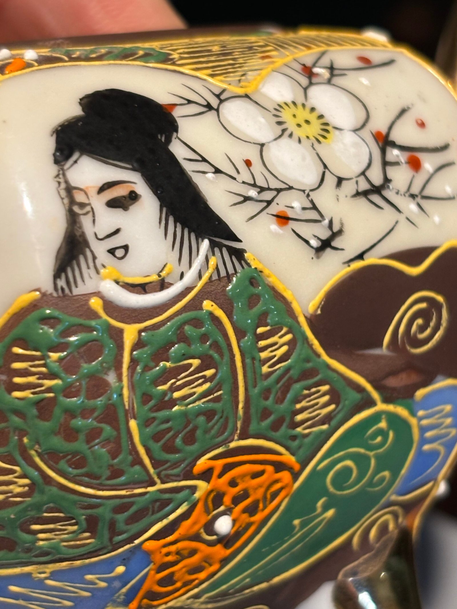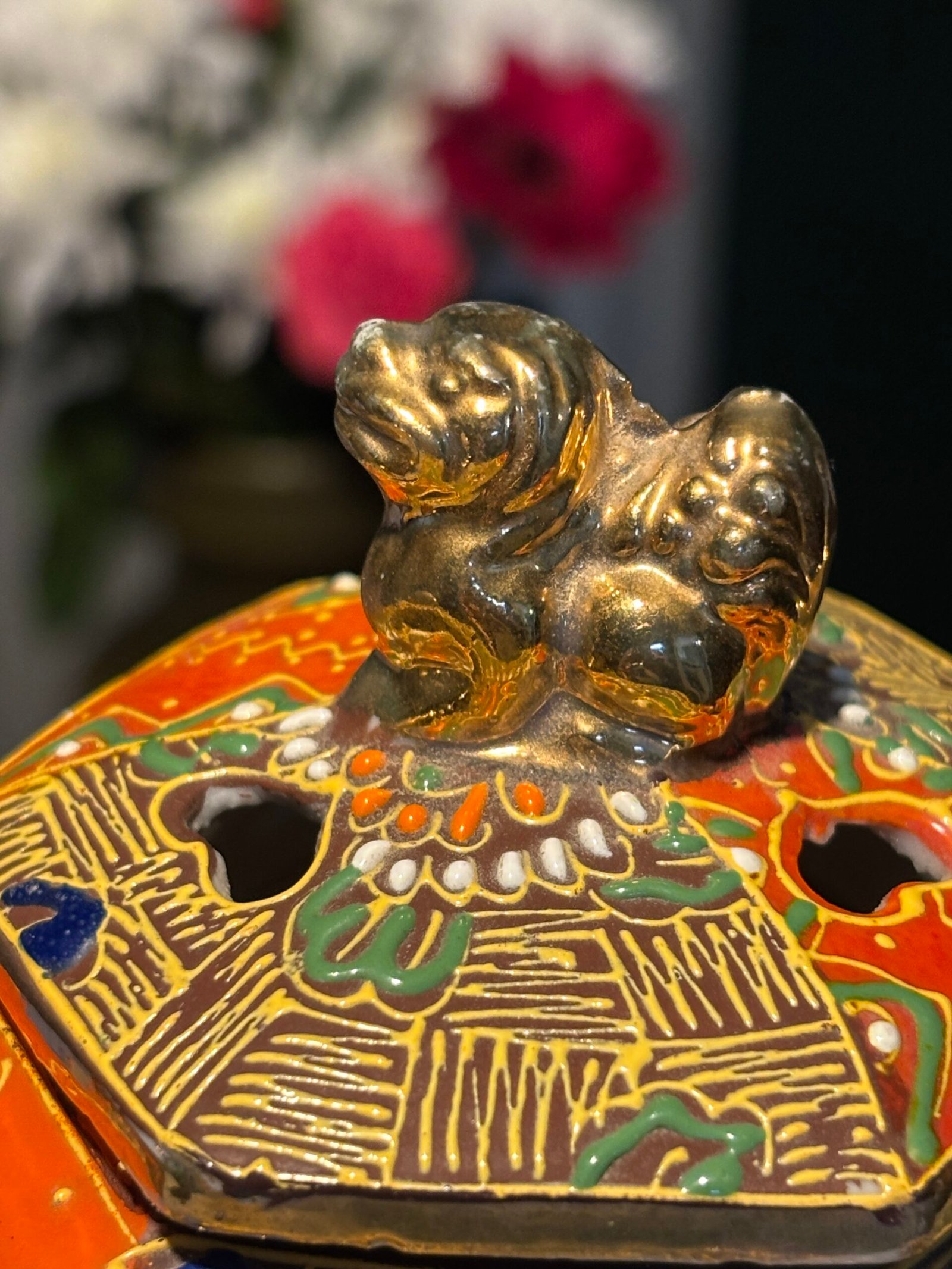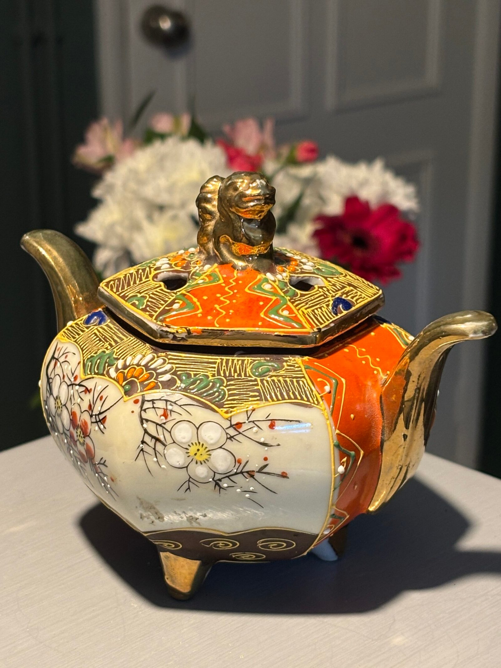 A beautiful vintage Japanese Satsuma-style tripod incense burner (Koro). This piece is richly decorated with traditional moriage (raised enamel) techniques, featuring hand-painted scenes of a Geisha and delicate floral motifs in vibrant oranges, greens, and gold gilding.