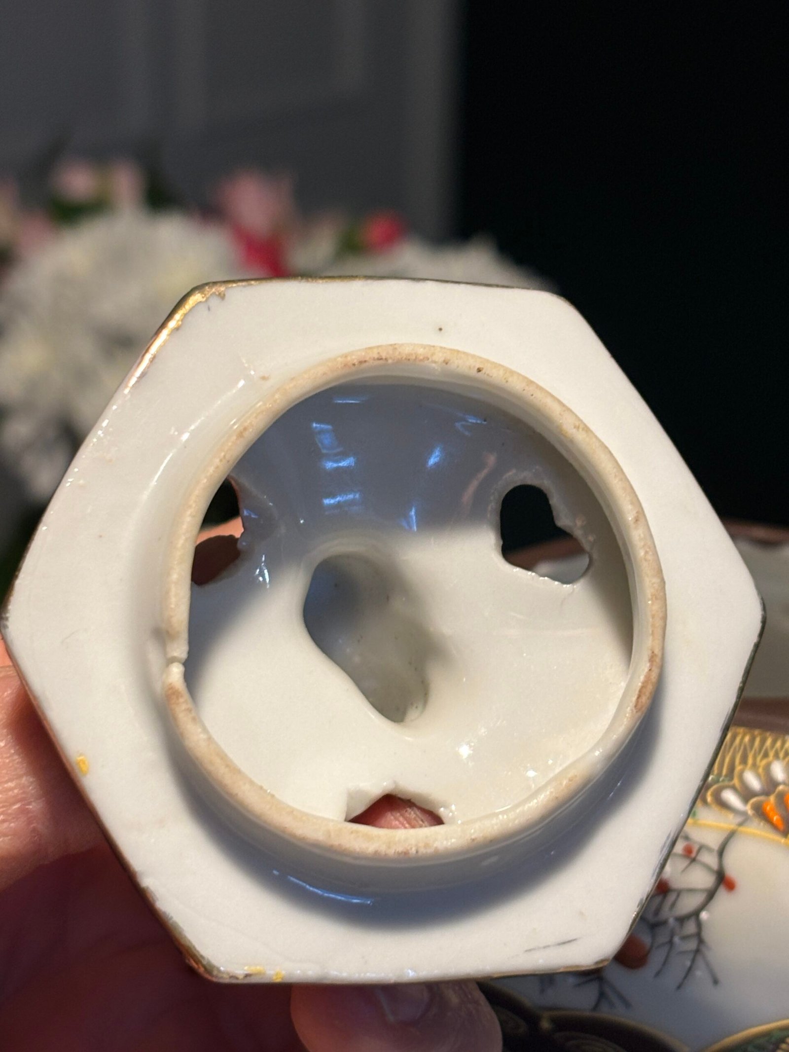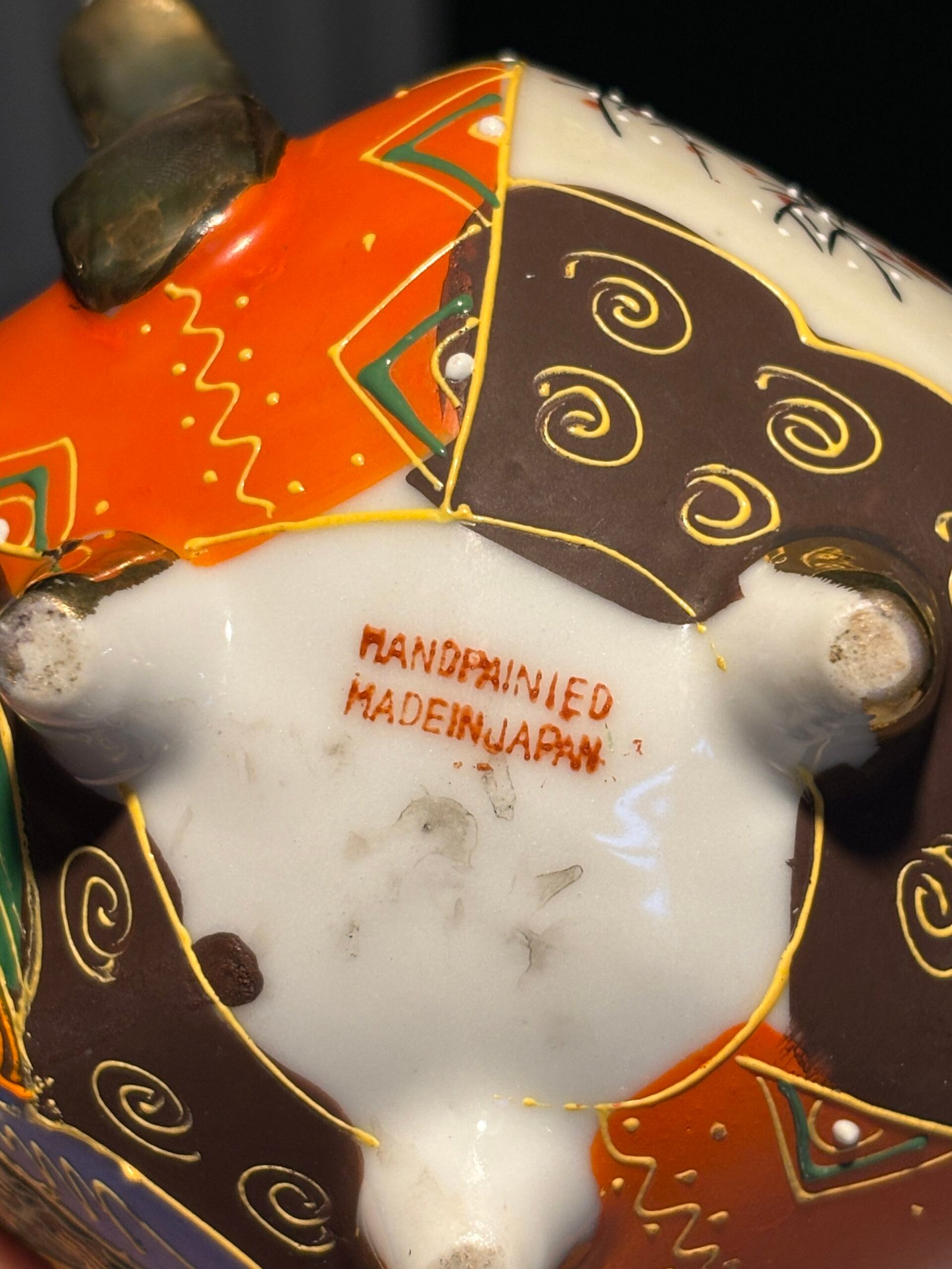 The lid is topped with a classic Shishi (Foo Dog) finial, and the vessel sits on three elegant tripod feet. The base is marked “Hand painted Made in Japan.”