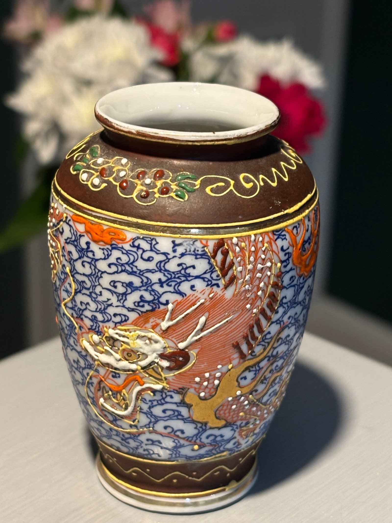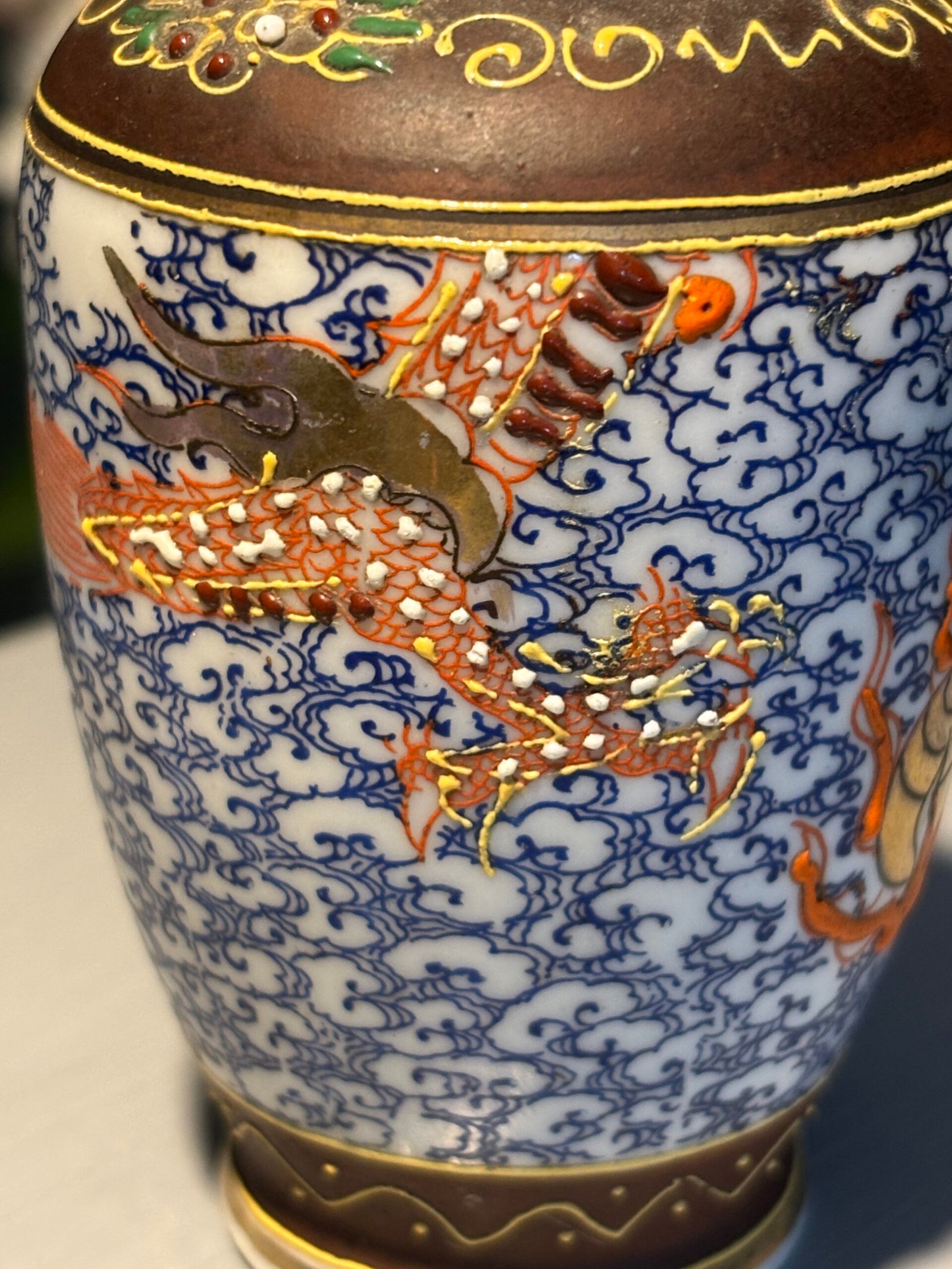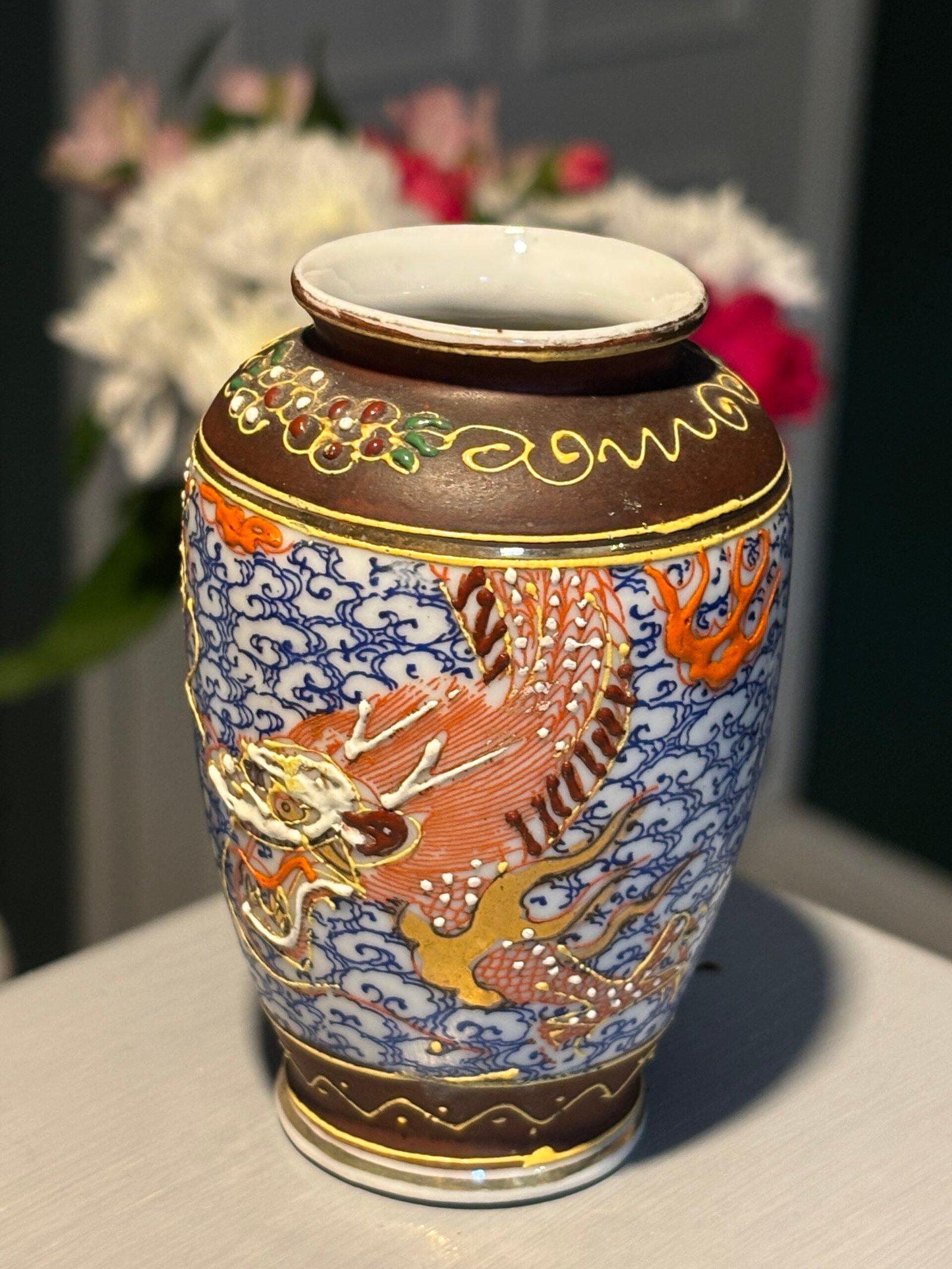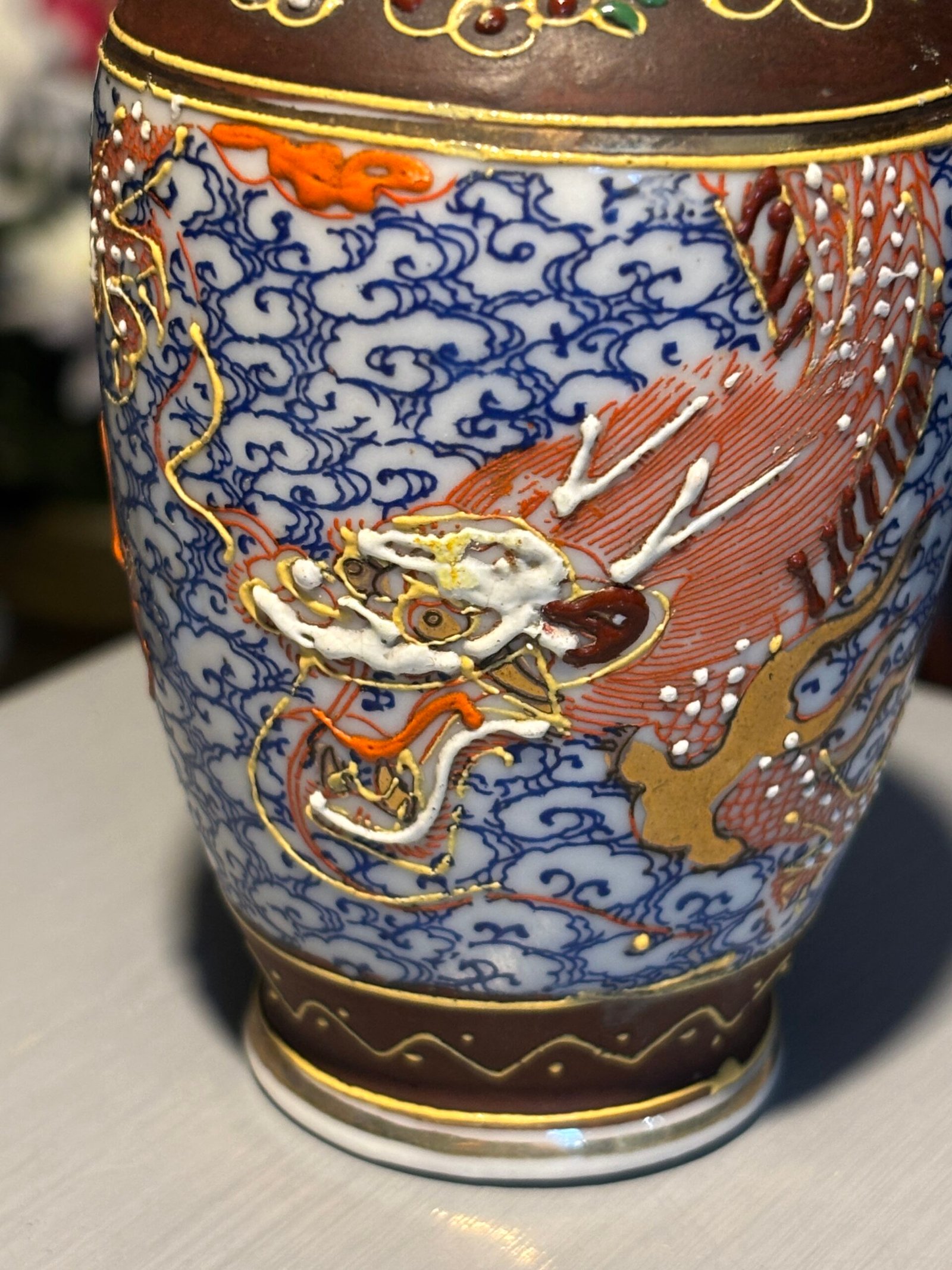 Vintage Mid Century Japanese Moriage Dragon Vase, Hand-Painted Raised Enamel 9.5cm
