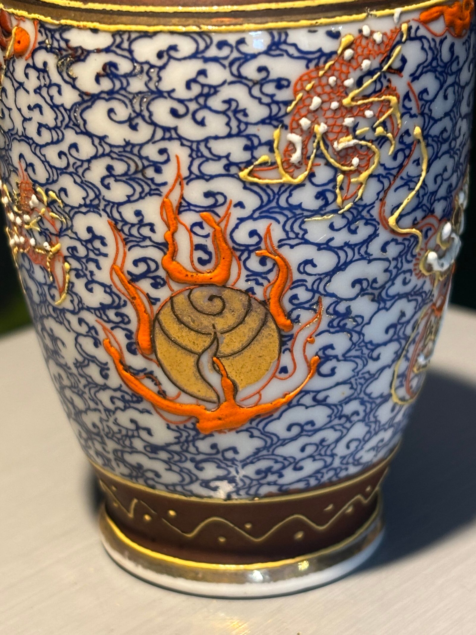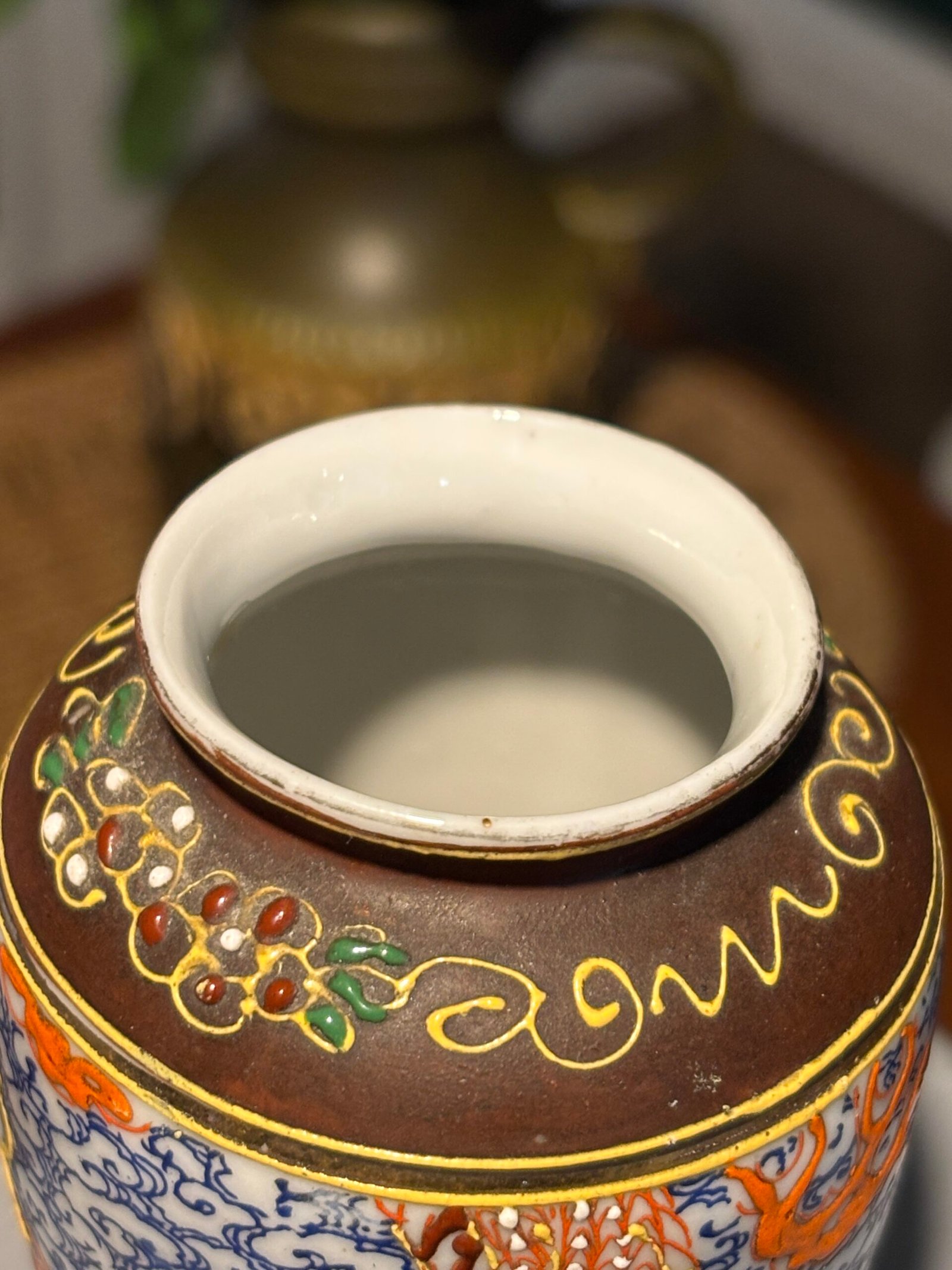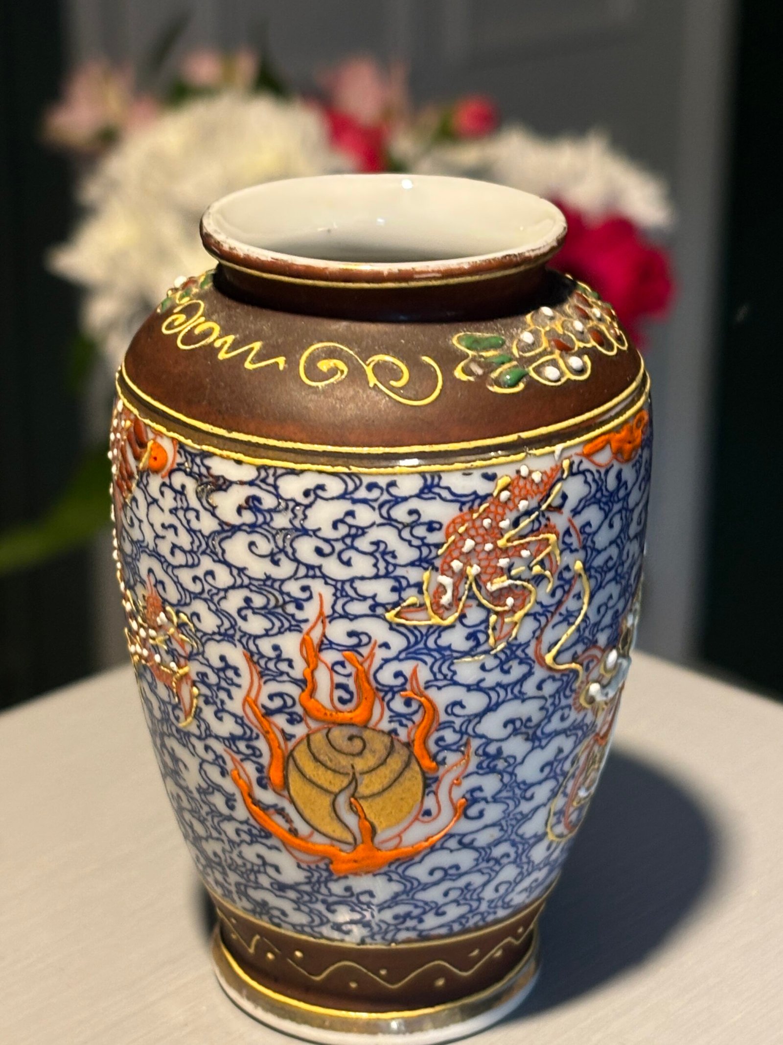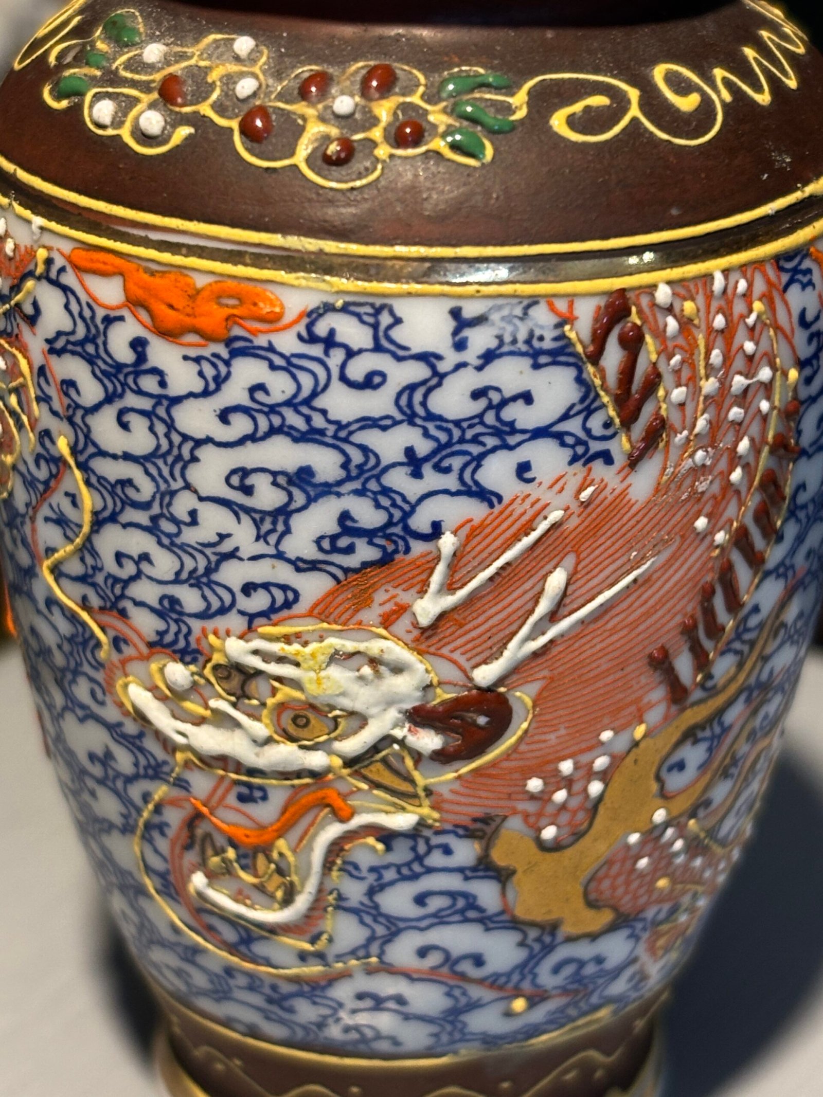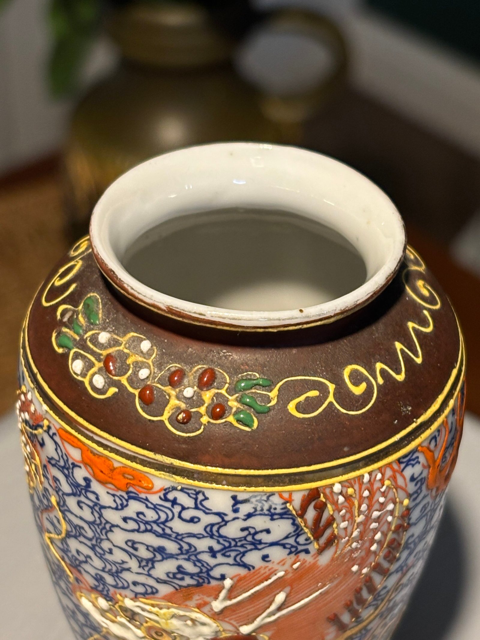 Vintage Mid Century Japanese Moriage Dragon Vase, Hand-Painted Raised Enamel 9.5cm