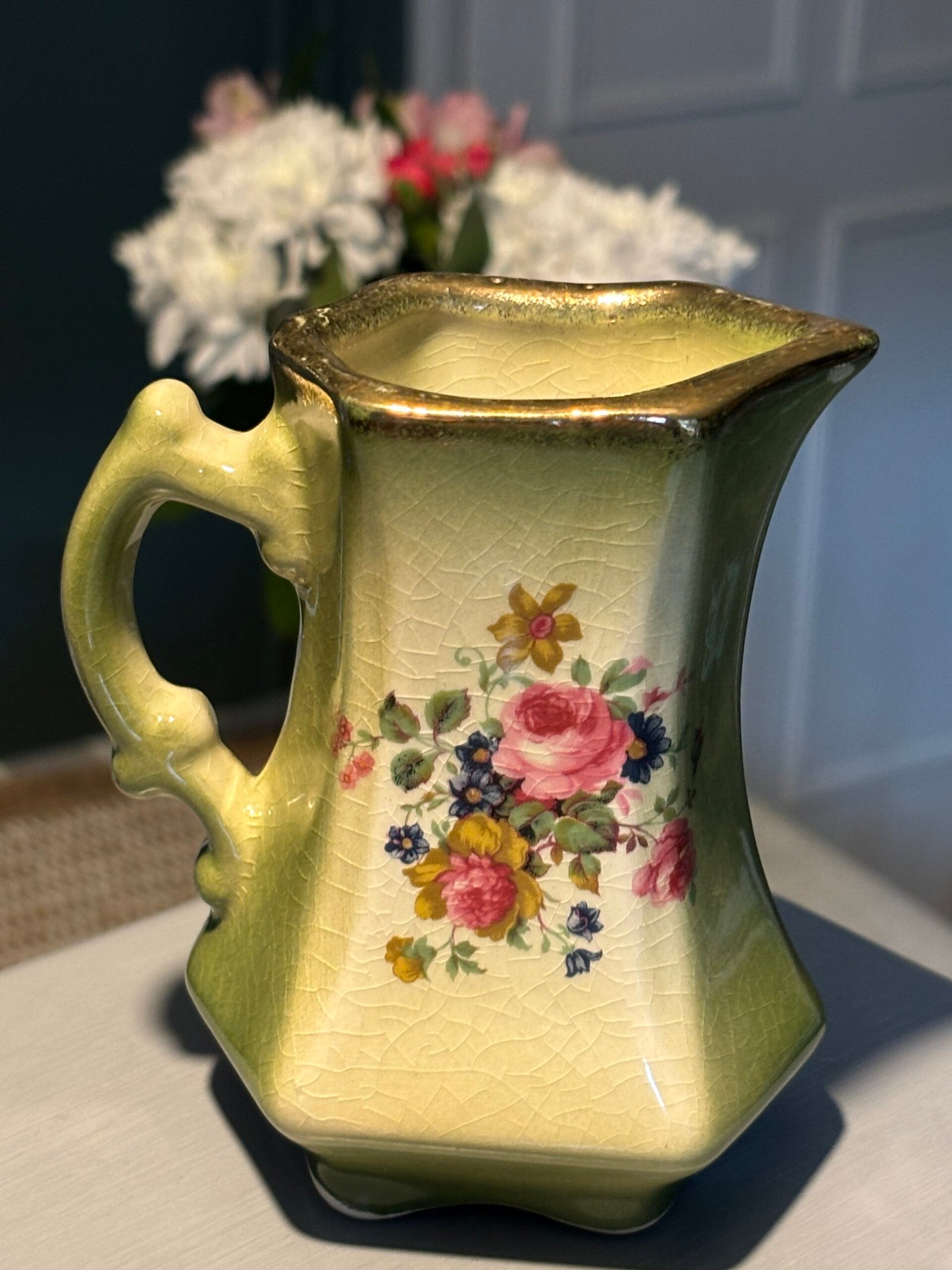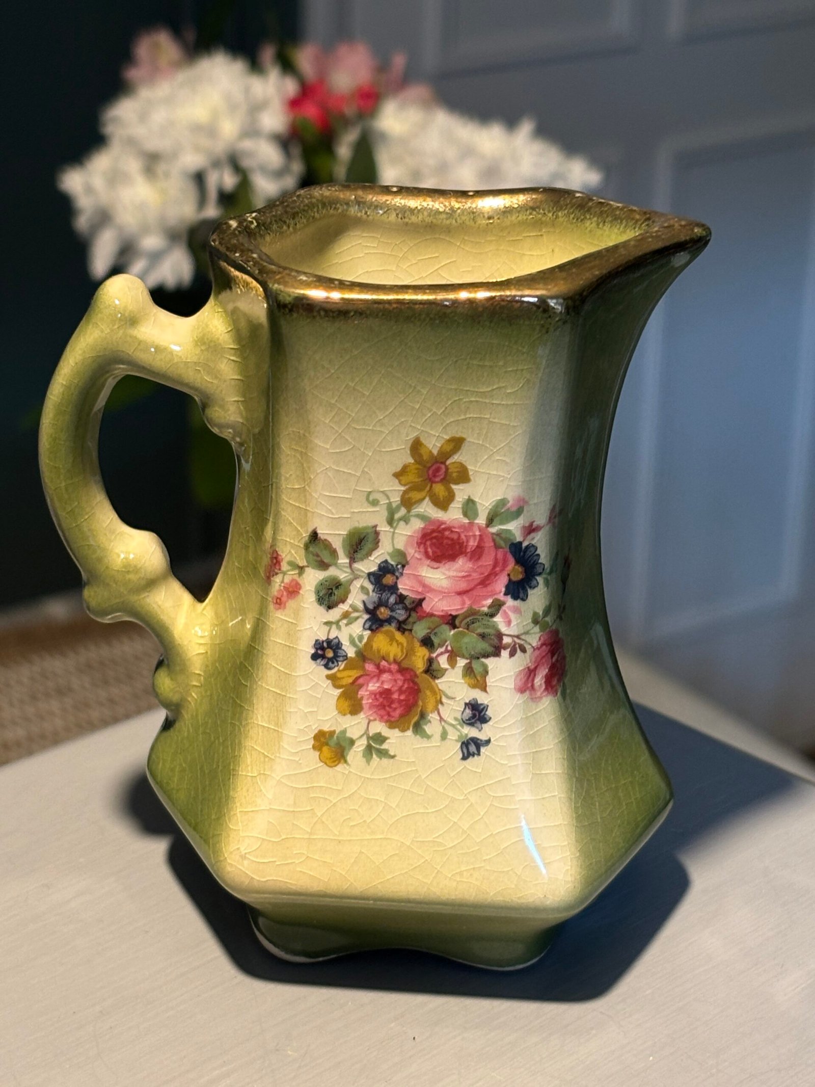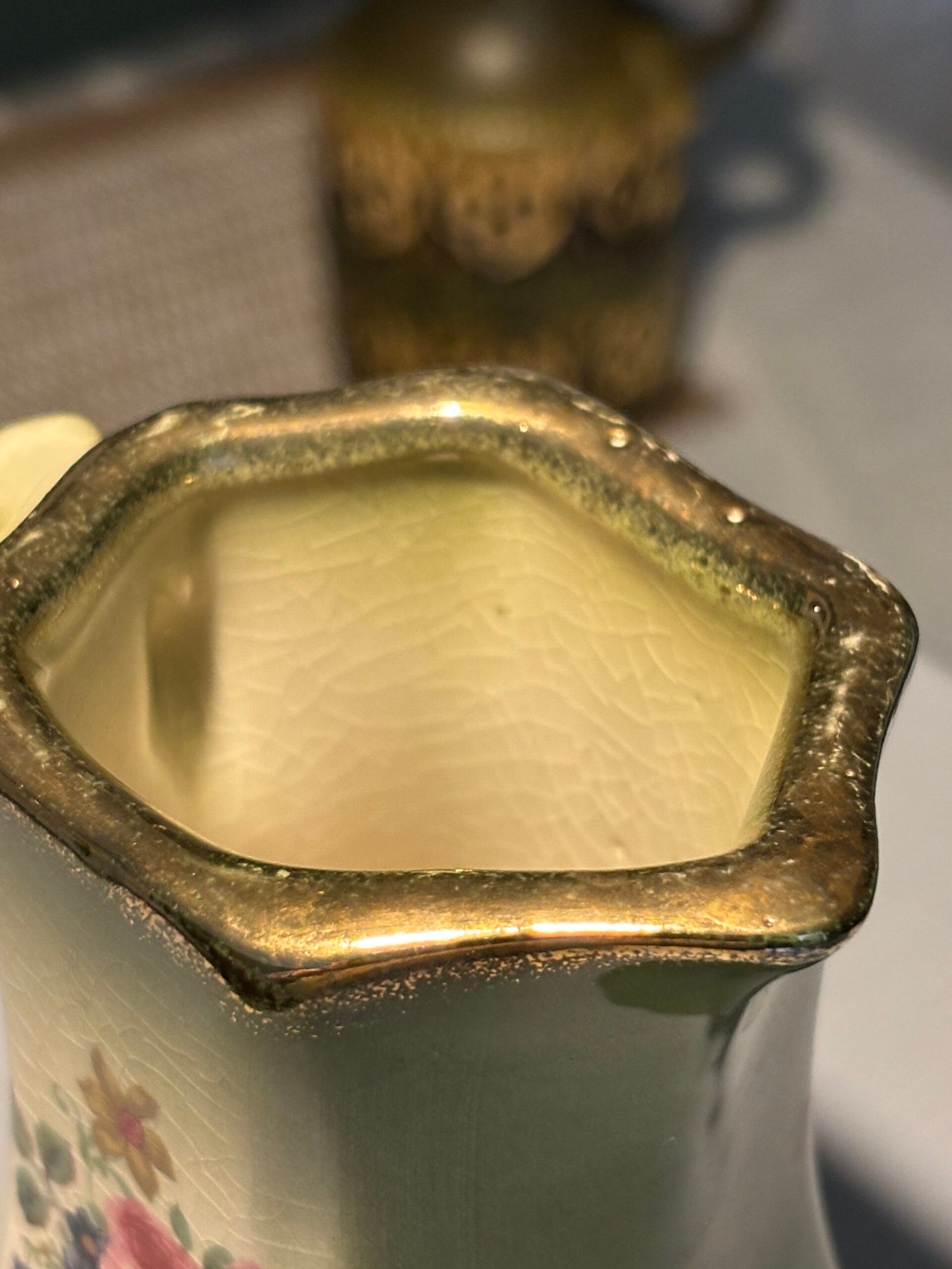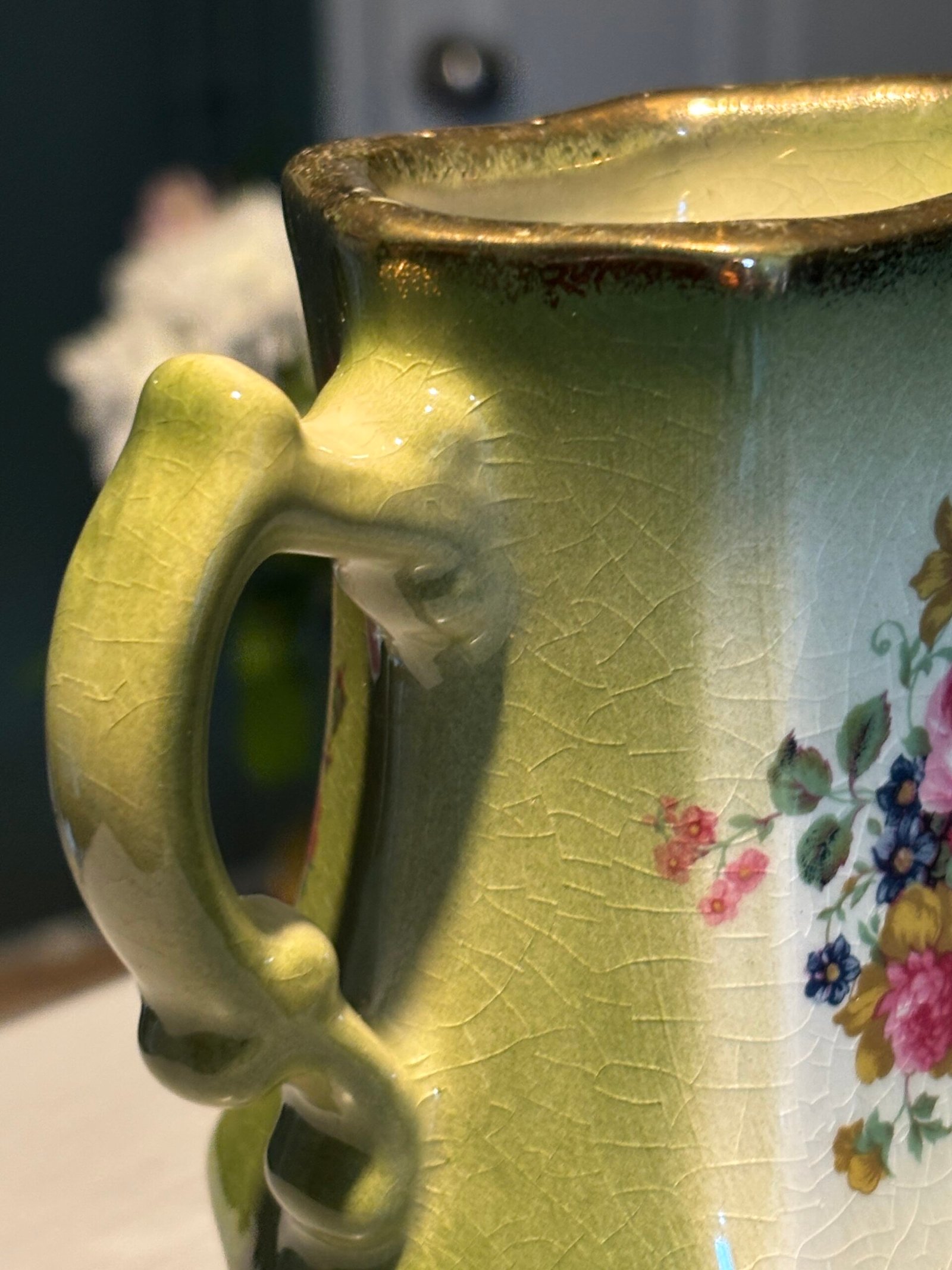 Add a touch of classic English farmhouse charm to your home with this beautiful green ironstone pitcher. Featuring a vibrant floral design with a pheasant motif, this piece is finished with a delicate gold-hand-painted rim.