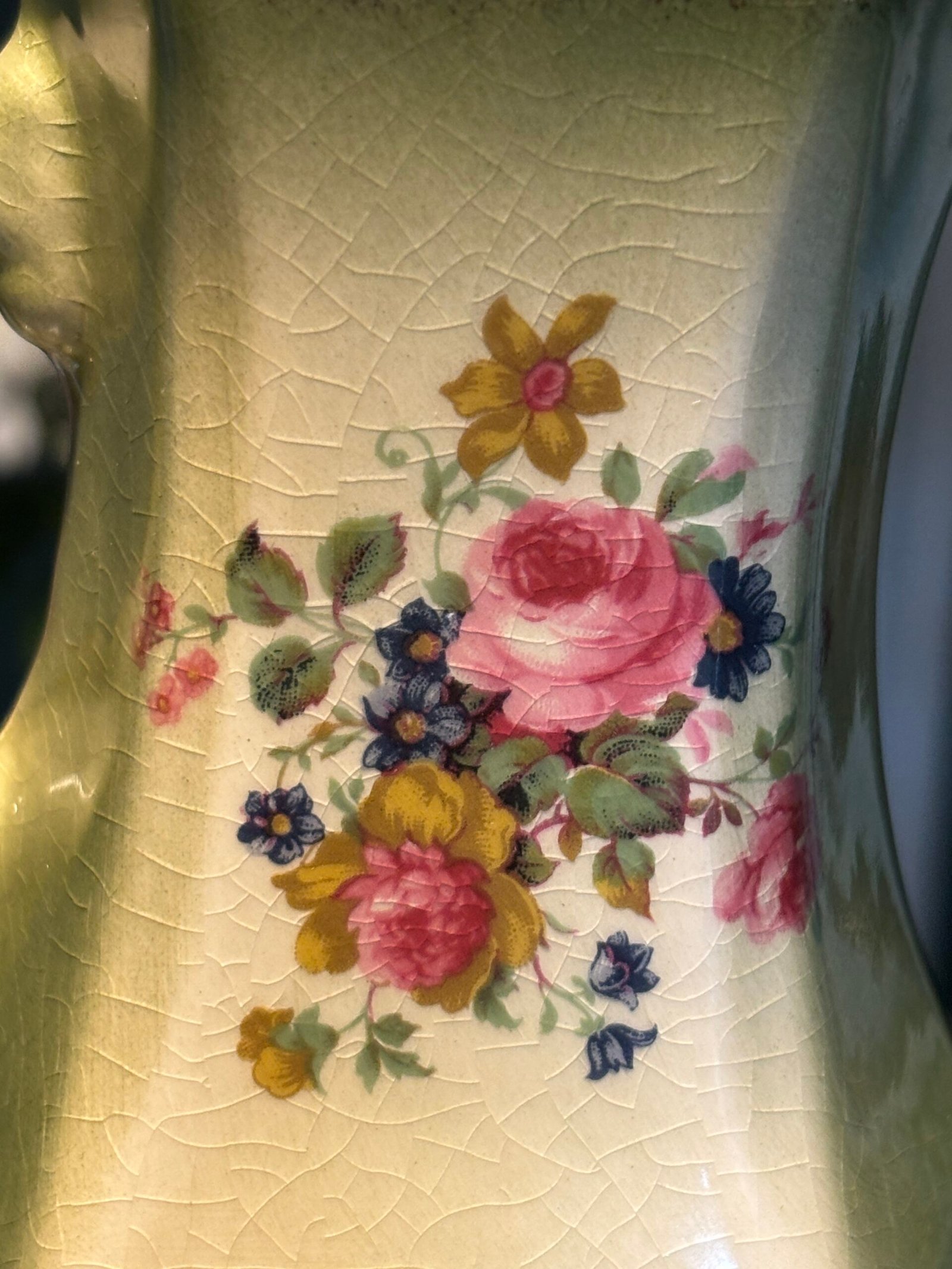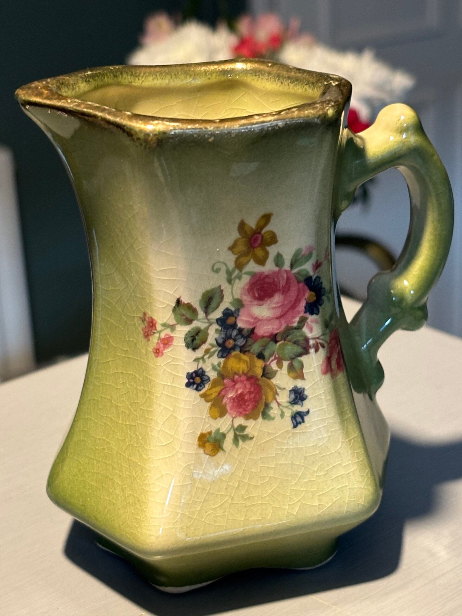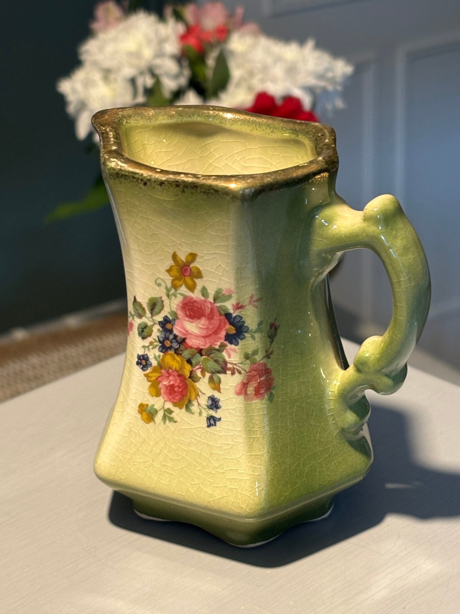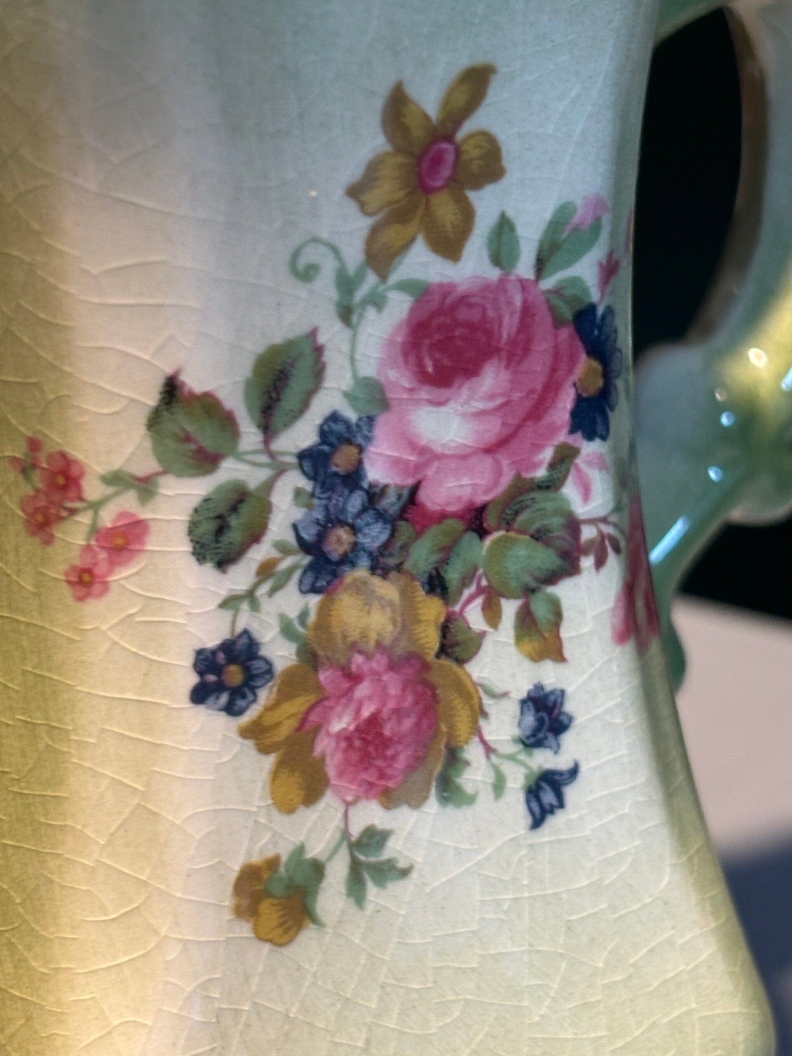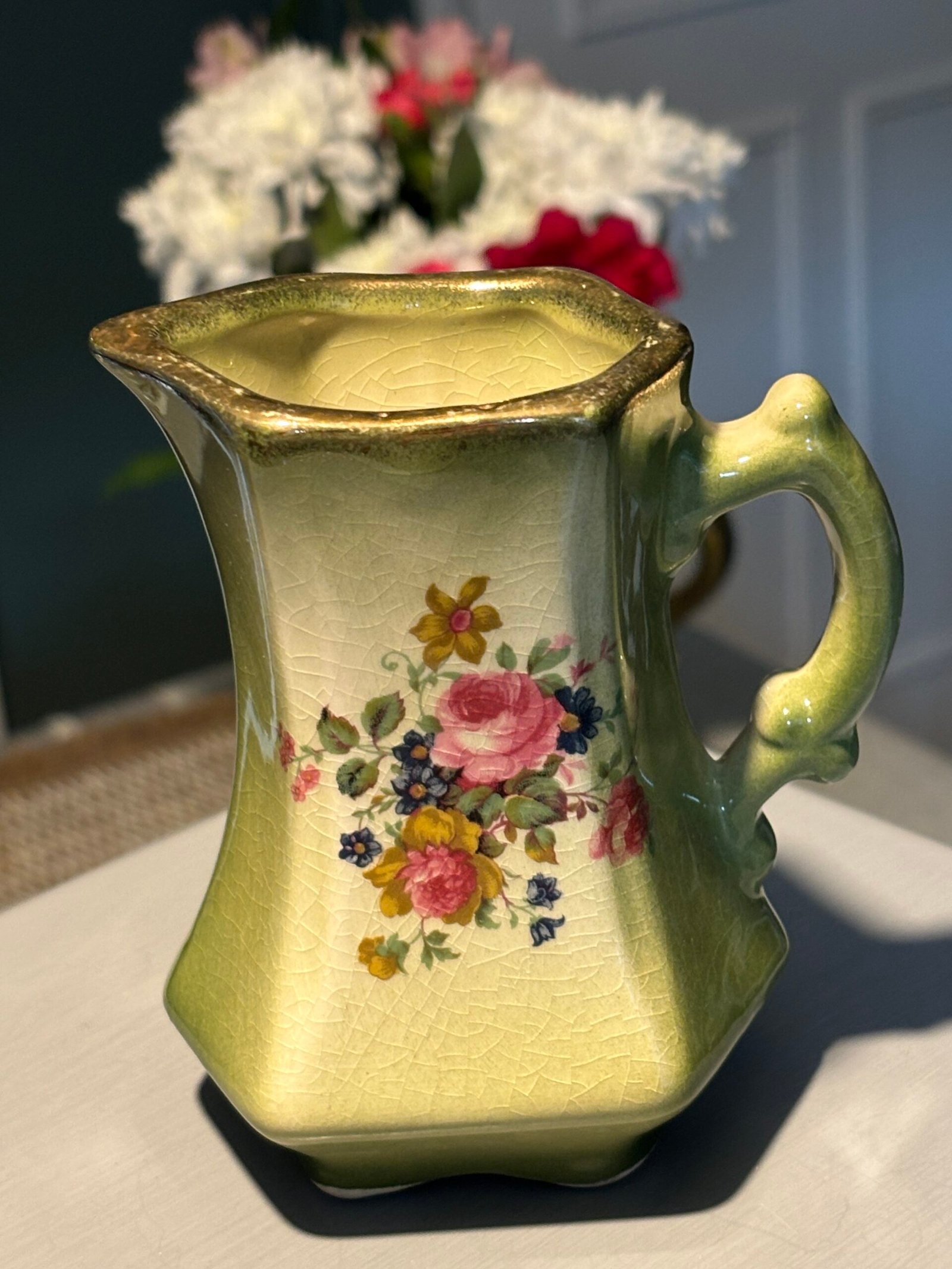Add a touch of classic English farmhouse charm to your home with this beautiful green ironstone pitcher. Featuring a vibrant floral design with a pheasant motif, this piece is finished with a delicate gold-hand-painted rim.