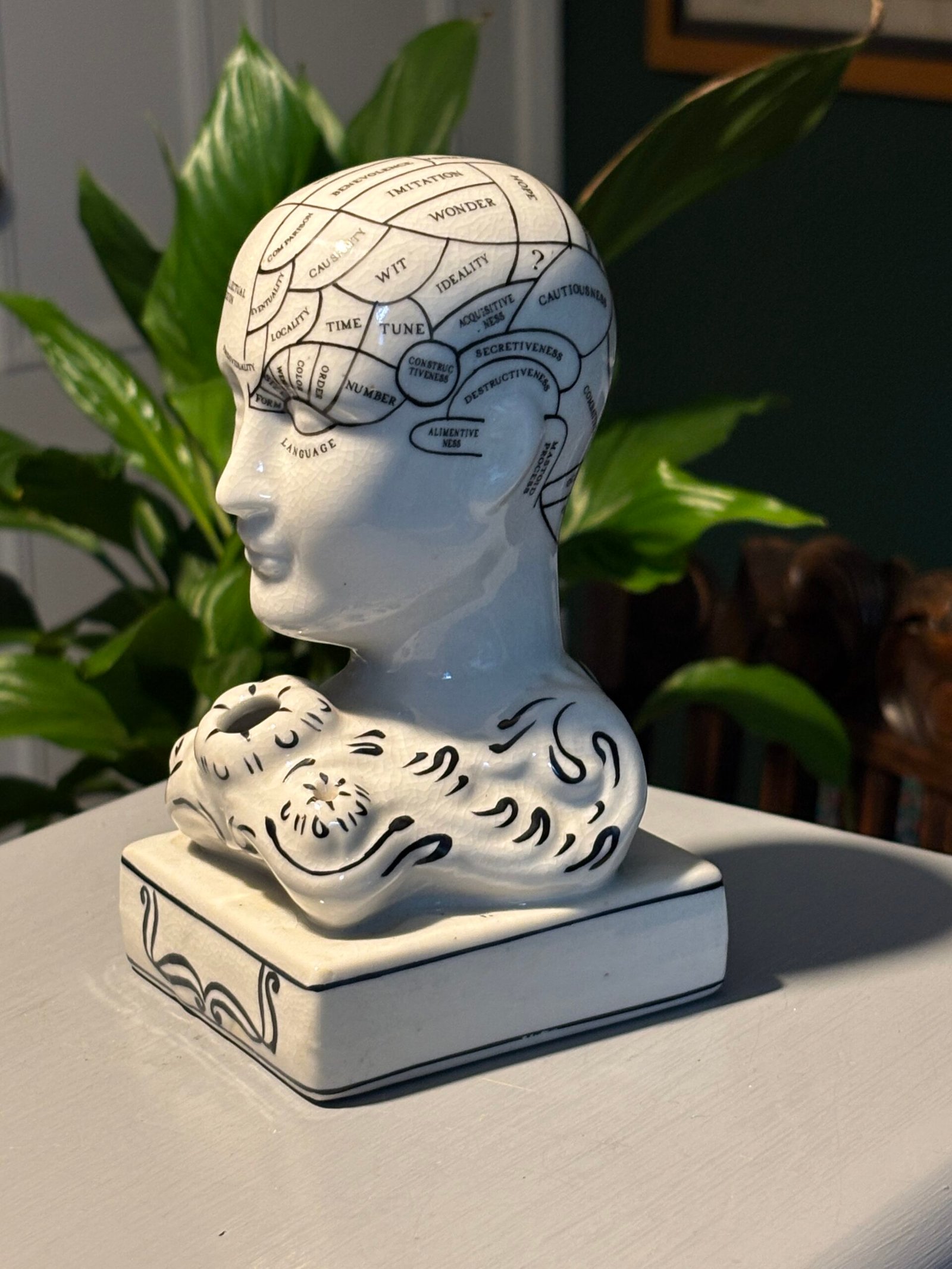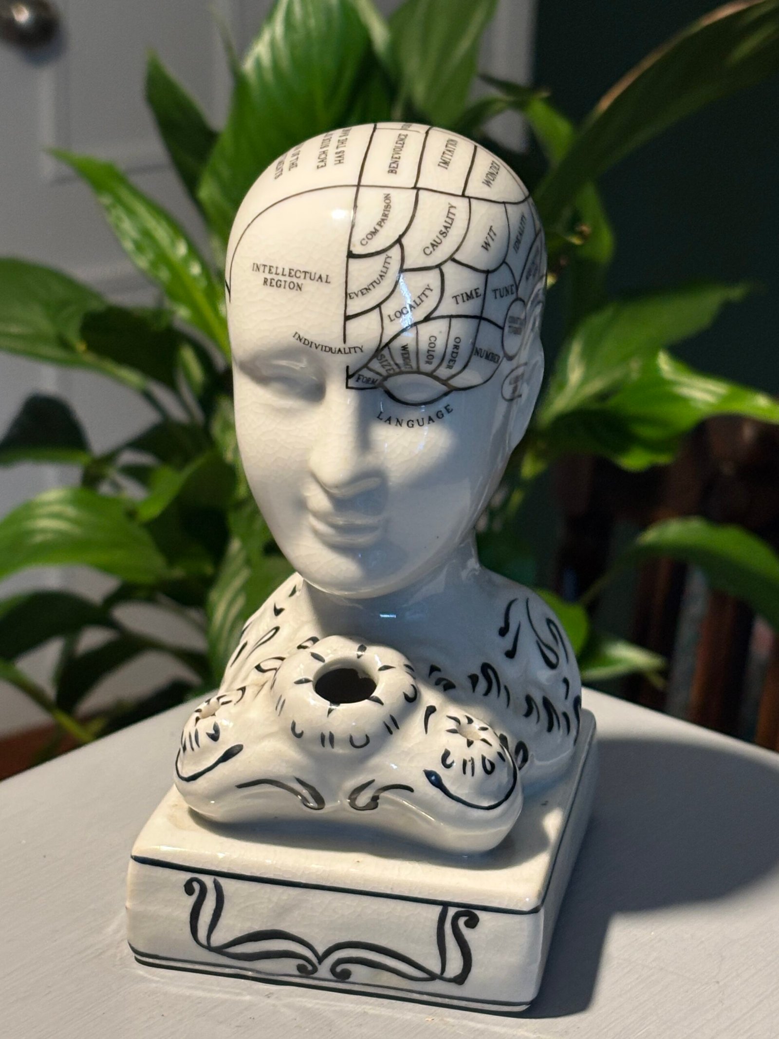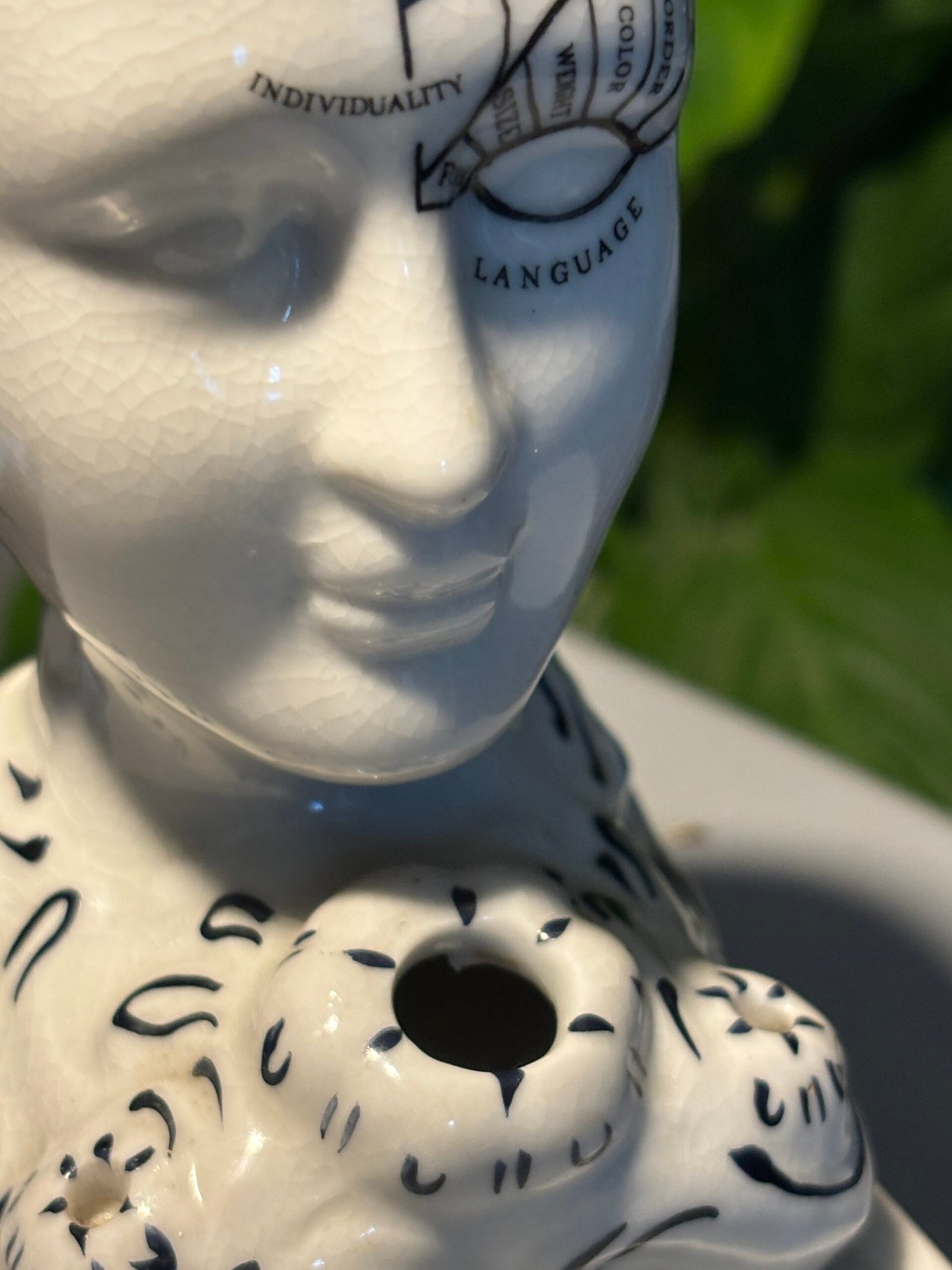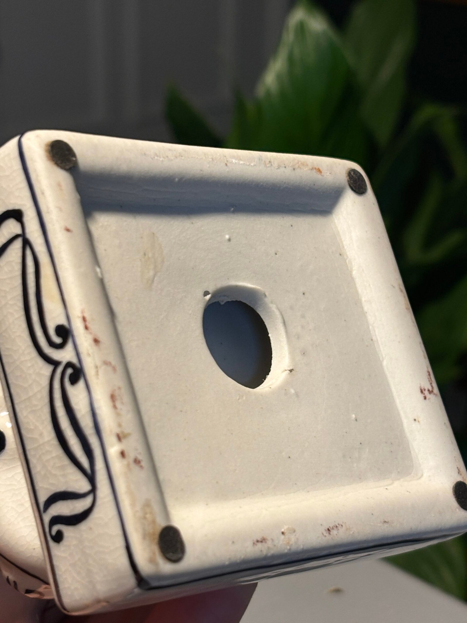 Perfect for a bookshelf, desk, or as a unique statement piece for fans of the dark academia or gothic aesthetic. Possibly a pen holder or inkwell. Material: High-quality glazed ceramic/porcelain. Finish: Features a lovely “crackle” glaze (crazing) that gives it an authentic antique feel.